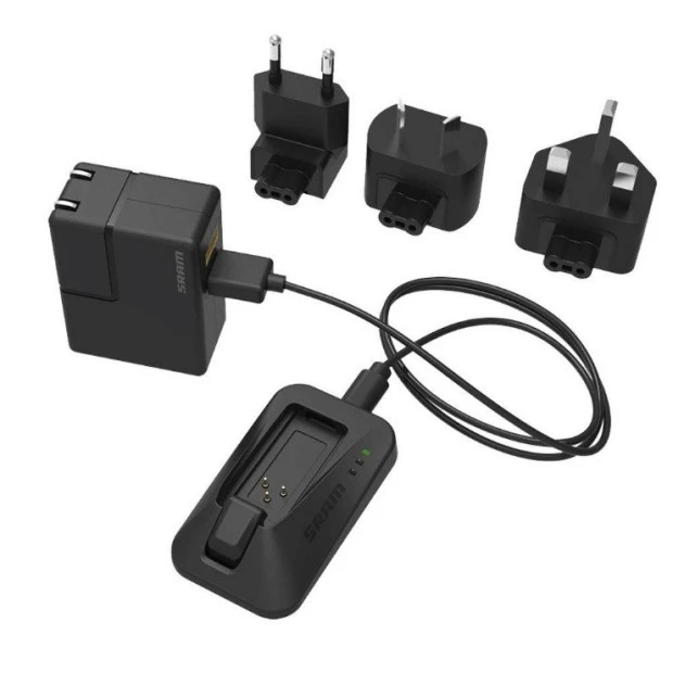 Sur la route ou à la maison, le chargeur de batterie SRAM contient tout ce dont vous avez besoin pour recharger vos batteries eTap ou AXS. Tous les adaptateurs sont fournis avec ce pack. Vous pouvez donc charger votre batterie Sram en Europe, en Grande-Bretagne et aux États-Unis.