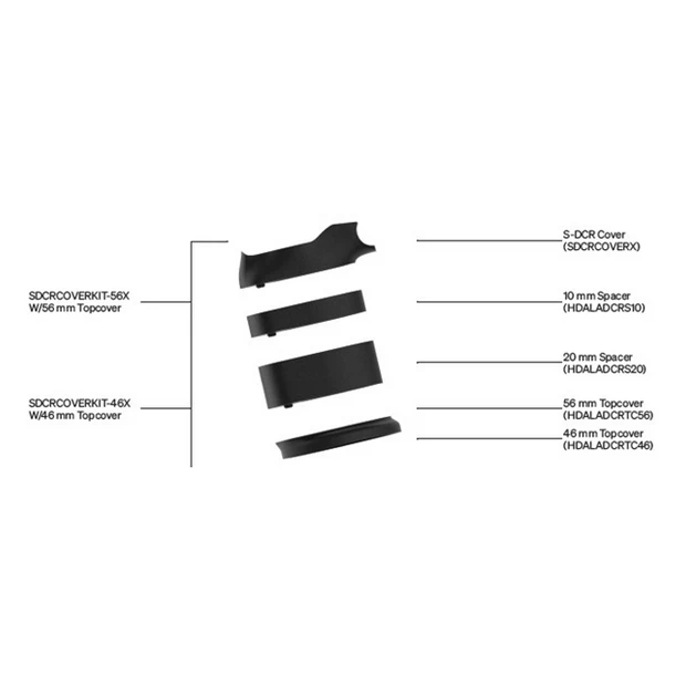 Le kit d’entretoises Deda Elementi S-DCR permet le routage interne des câbles et gaine, même avec des potences ne le permettant pas, comme les Superleggero, Zero100, Zero2, Zero1 et Peak, sur des cadres DCR (Deda internal cable routing). Elle offre la possibilité d’intégration complète des gaines dans le cadre, comme le jeu de direction DCR, mais en laissant une partie des gaines visibles sous la potence. Le système fonctionne avec un pivot de fourche conique standard (1-1/8″ – 1.5″) et nécessite un roulement supérieur de 52mm (1.5″). La conception spéciale de la bague de compression laisse de la place pour que les câbles puissent s’insérer dans l’espace entre le roulement du jeu de direction et la fourche. Le kit de couverture S-DCR est disponible avec un topcover de 56 mm pour les cadres DCR standard ou avec un topcover de 46 mm pour les cadres dotés d’une fourche de type D-shape.