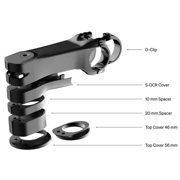 Cette potence fonctionne avec un pivot de fourche standard de 1-1/8″, la potence est compatible avec un tube de direction supérieur de 46 mm (pour un roulement de 1-1/8″) ou de 56 mm (pour un roulement de 1,5″). L’ensemble de la potence comprend des entretoises spéciales qui fournissent les canaux pour les câbles du boîtier. Les entretoises et le revêtement en nylon sont conçus avec des fentes qui leur permettent de s’ouvrir, ils peuvent être ajoutés ou retirés pour obtenir le bon ajustement sans avoir à retirer tous les câbles.
