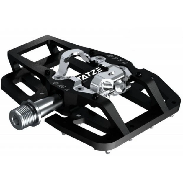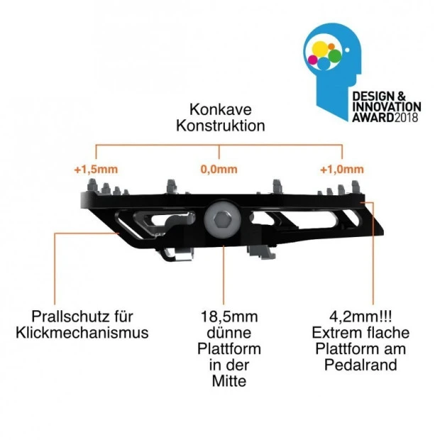 Les pédales Tatze Two Face sont à la fois des pédales plates très puissante et des pédales automatiques efficaces. Les 14 pitons avec une élévation ciblée assurent une adhérence optimale. Du côté du clic, les 4 pitons réglables en hauteur créent une connexion particulièrement étroite entre les pédales et les chaussures. Pour une garde au sol optimisée, le côté plat est tourné de 2,5° vers le côté clic, ce qui augmente la garde au sol aux points cruciaux de 5 mm.